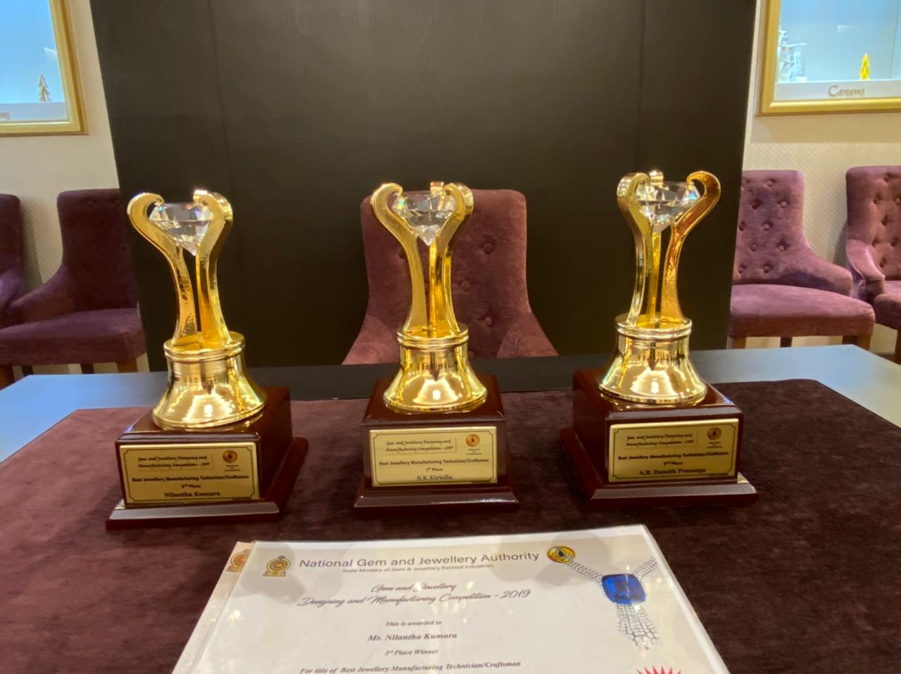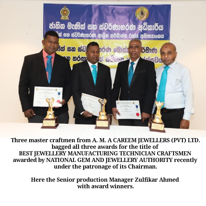 Three master craftsmen from A.M.A. CAREEM JEWELLERS (PVT) LTD bagged all three awards for the title of BEST JEWELLRY MANUFACTURING TECHNICIAN CRAFTSMEN awarded by NATIONAL GEM AND JEWELLERY AUTHORITY recently under the patronage of its Chairman.