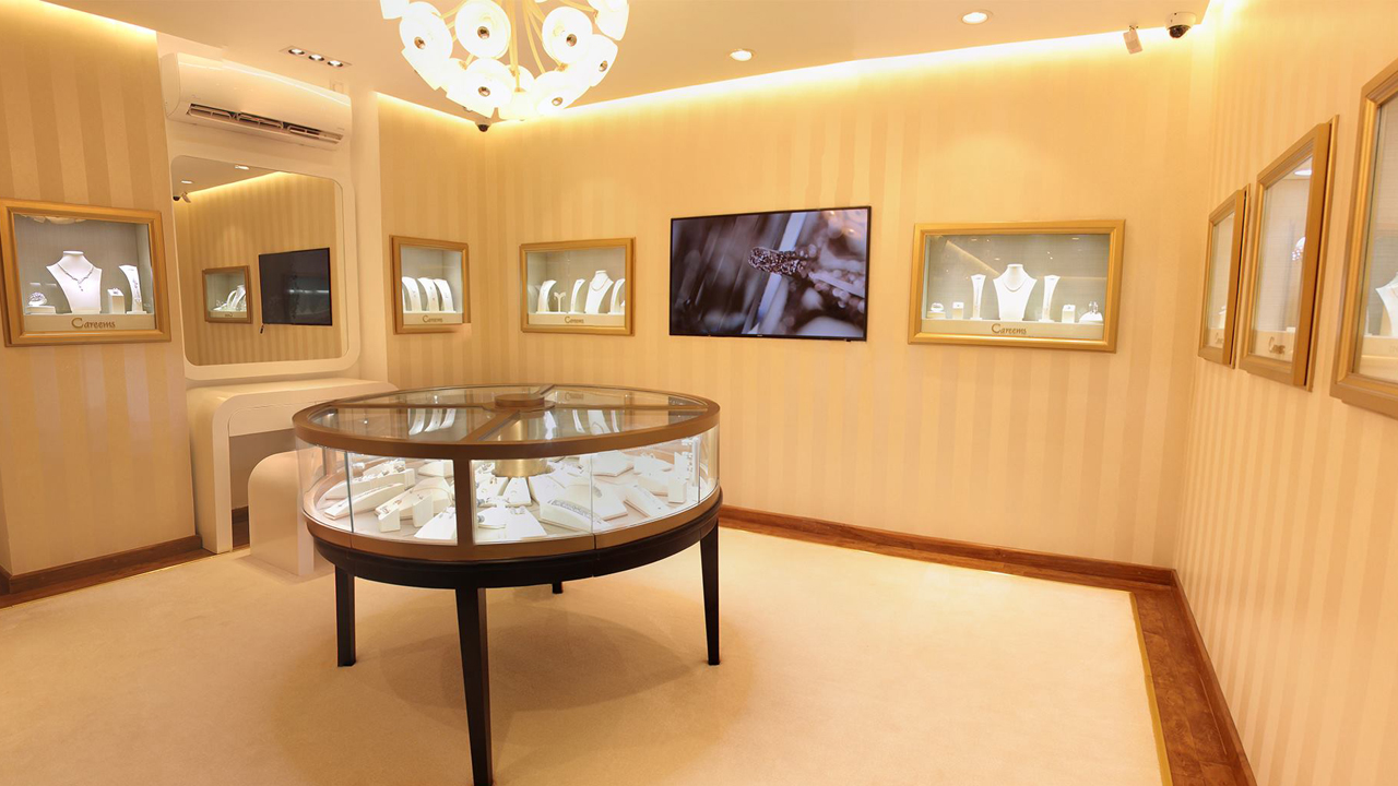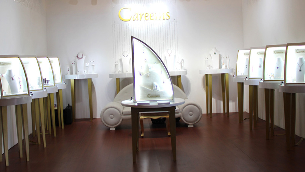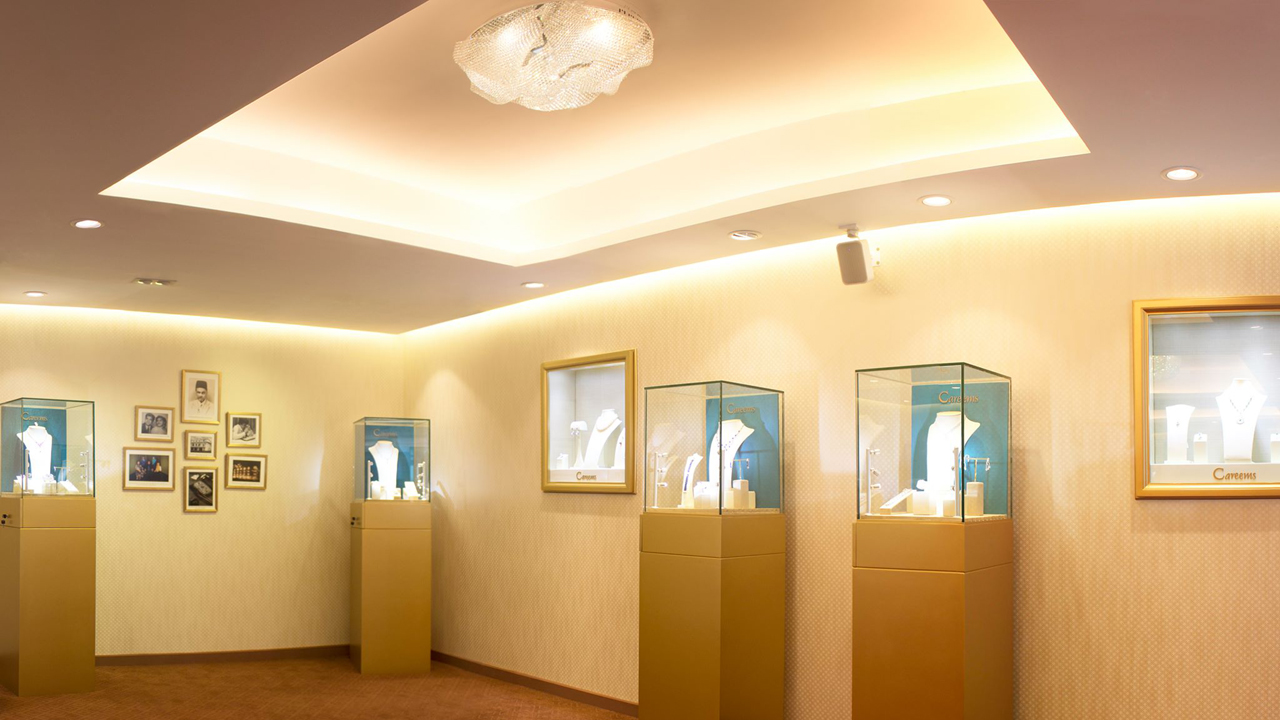 The exterior of the store has a clean form and beautiful shimmering copper-brown appearance. The glass façade entrance leads to the main hall of the store where the interior reflects tones of gold, brown and Champaign. A nostalgic photo wall illustrates the 128-year heritage of Careems. A one of a kind sculpture made from tools used to manufacture jewellery is a novel addition to the store. Most importantly an impressive collection of classical and contemporary jewellery and gemstones adorn numerous wall and table showcases positioned around the showroom.